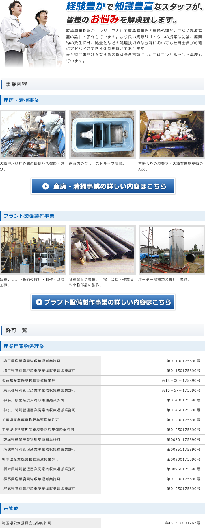 グリーストラップの清掃・管理、産業廃棄物処理、各種プラント工事、オーダー機械の設計・制作等、環境に関する様々な事業に取り組んでおります。